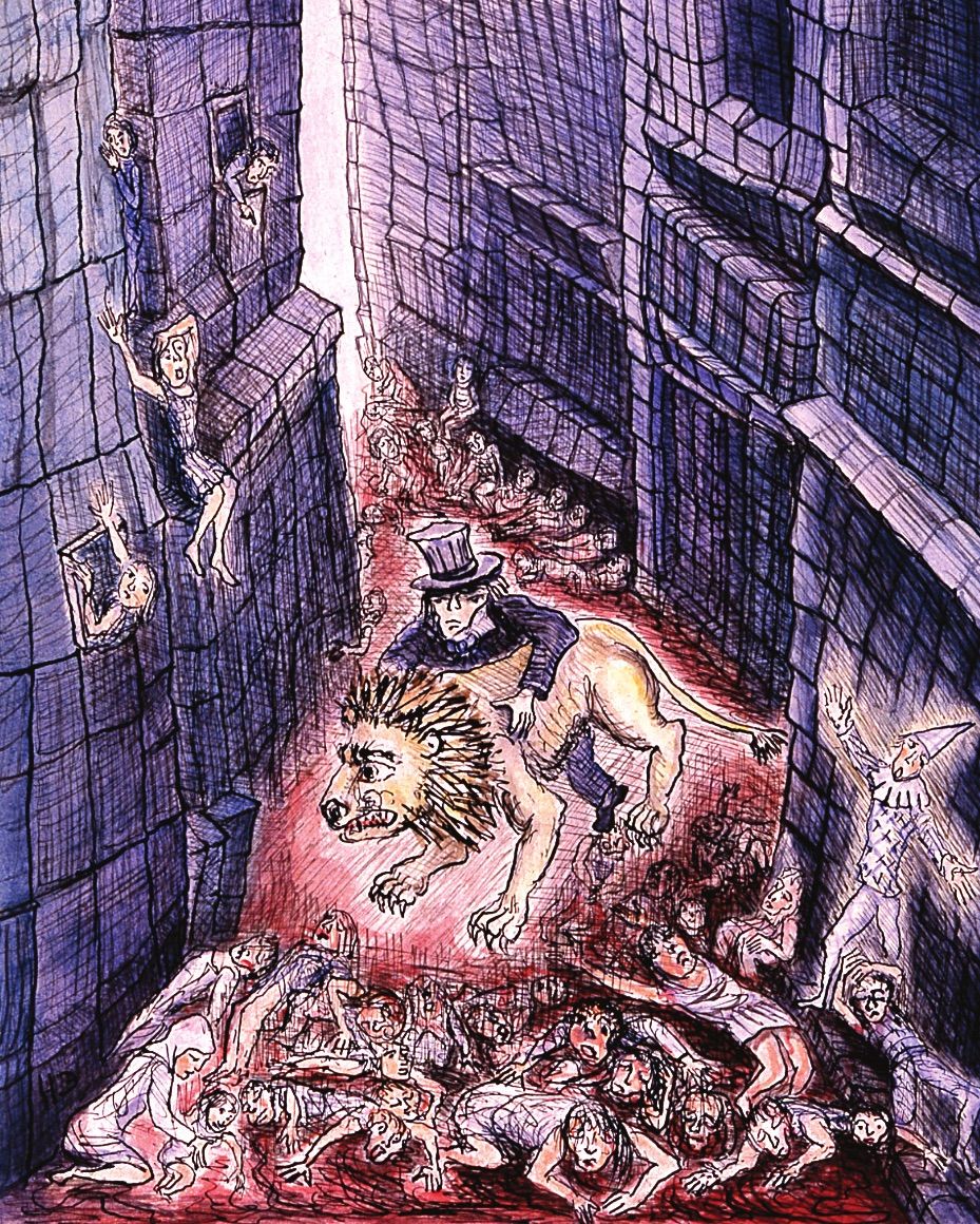 Emmy Haeseles Bildwelt ist überaus komplex. Ihre Zeichnungen wirken angesichts der Fülle von Figuren und architektonischen Elementen auf den ersten Blick oft verwirrend. Zwar ist die Darstellungsweise stets gegenständlich, doch erscheinen ihre Szenerien wie aus einer anderen, erschreckenden Wirklichkeit, einer Welt der apokalyptischen Katastrophen. Schauplätze dieser Katastrophen sind Ruinenlandschaften, brennende mittelalterliche Städte, reißende Gewässer, kalte und trostlose Felsformationen oder groteske Bühnen und Arenen. Diese Schauplätze sind von vielen, oft zahllosen Menschen bevölkert. Ihr hastiges Treiben scheint keinen Sinn zu ergeben, sie irren ziellos und wie von einer höheren Macht gejagt in einer unbehausten (Unter-) Welt herum. Die Figuren, darunter viele Kinderdarstellungen, sind zwar individuell ausgearbeitet, doch scheinen sie alle das gleiche furchtbare Schicksal einer Vorhölle zu erleiden. Eine Figur aber scheint gegen den Strom der Getriebenen und Verdammten zu schwimmen; es ist die Gestalt des Harlekin, des Narren oder Eulenspiegel, die den Weg weist und Hoffnung verkündet. Im Narren sieht Emmy Haesele einen Weisen und Hoffnungsträger für die im Elend gefangene Menschheit. Auf fast jeder Zeichnung der Künstlerin finden sich Tierdarstellungen. Während der Harlekin oft von einem kleinen Vogel begleitet wird und verschiedenes Kleingetier menschlichen Wesen manchmal wie ein Attribut anhaftet, bildet in anderen Zeichnungen und diese zählen zu den eindrucksvollsten, eine monströse Tiergestalt das Hauptmotiv. Diese Tiermonster ob Drache, Raubfisch, Riesenvogel, Ratte, Schlange oder Ameisenbär symbolisieren die Bedrohung und Gefahren dieser Welt, sie stehen für Laster und Verführung, für Strafe und Rache.