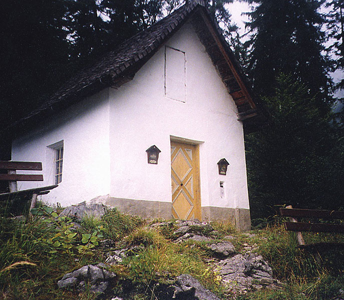 Dort hat man 1889 das alte Antoniusbild, das von den Franzosen während der Freiheits kriege von einer Kugel durchlöchert worden war, ersetzt und „vom rühmlichst bekannten Maler Gold in Salzburg ein ganz neues, naturgetreues Bild (!) des Heiligen malen lassen.“ Am 15. Mai 1922 starb Josef Gold in Salzburg. Früher waren die Wände noch voller Votiv - tafeln, Krücken und Prothesen, die in Dank - barkeit und zur Erinnerung hier platziert wurden. Leider hat gedankenloser Vandalismus, geschmacklose Sammlerleidenschaft und ein Mangel an Achtung vor dem Glauben anderer diesen Platz verändert. Gleich geblieben ist das Bedürfnis der Menschen, ihre lieben Toten in der Obhut dieses gnadenvollen Orts zu lassen. Die vielen Sterbebilder, nicht nur von Einheimischen, sind ein Zeugnis. Hinter der Türe: eine Station des alten Kreuzweges.